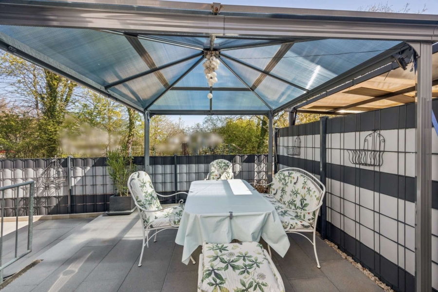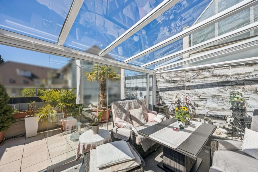Die nordöstlich ausgerichtete Terrasse, welche Sie von der Küche aus erreichen, eignet sich ideal für ein Frühstück in der Morgensonne, während der an den Wohnbereich angrenzende Außenbereich in Süd-West-Ausrichtung mit Wintergarten inkl. Panoramaschiebetüren, Beschattungsmöglichkeit und Heizofen einen ganzjährigen Aufenthaltsort bietet. Und das Beste? Beide Außenbereiche sind von der Straße aus nicht einsehbar – maximale Privatsphäre für Ihre Zeit zu Hause.