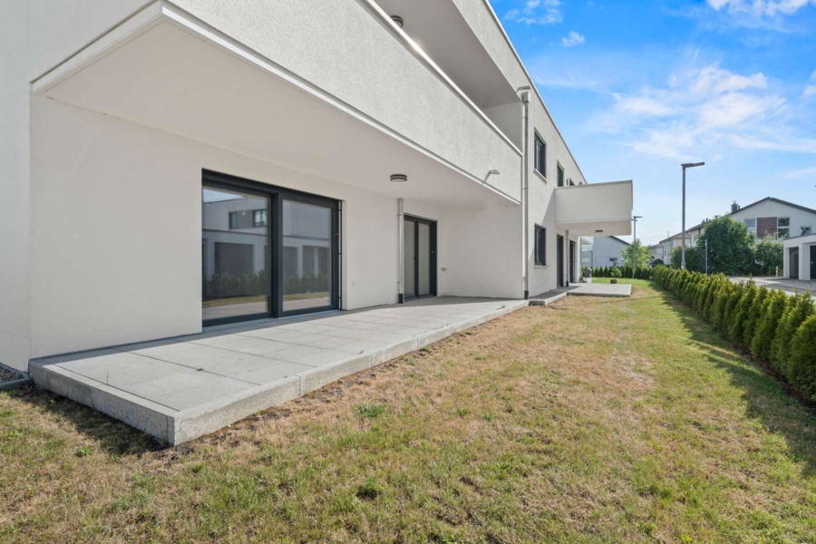 Ein besonderes Highlight ist der private Gartenbereich rund um die Wohnung: ca. 130 m² Sondernutzungsfläche bieten Platz für Kinder, Spielgeräte oder einfach zum Entspannen im Grünen – direkt von der großen, überdachten Terrasse (rund 20 m²) aus zugänglich.